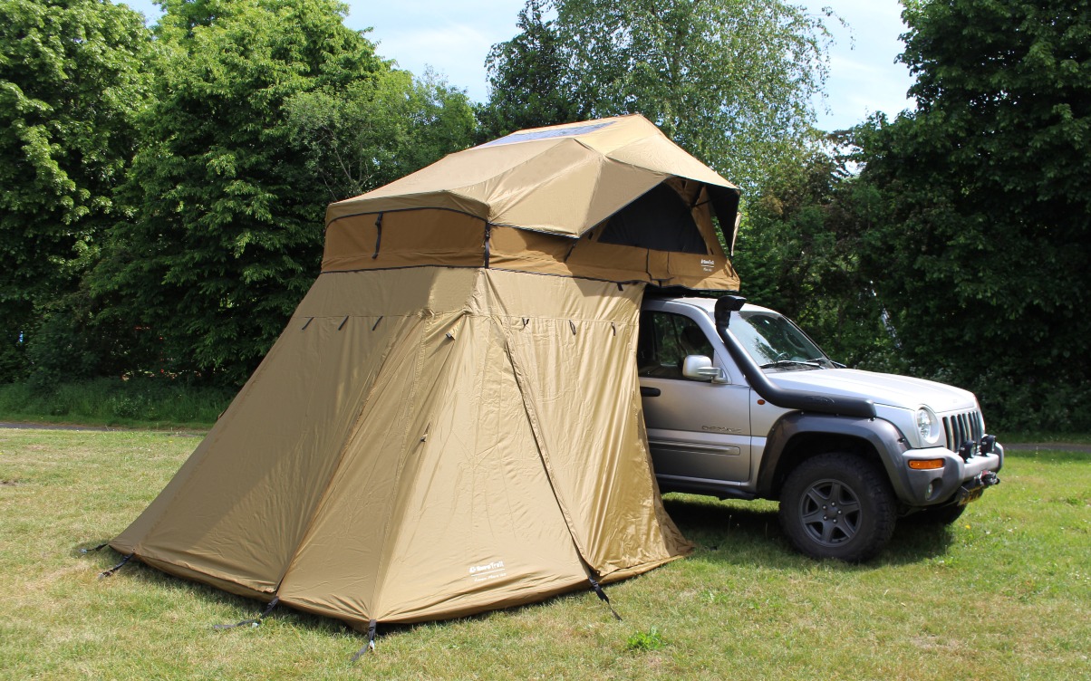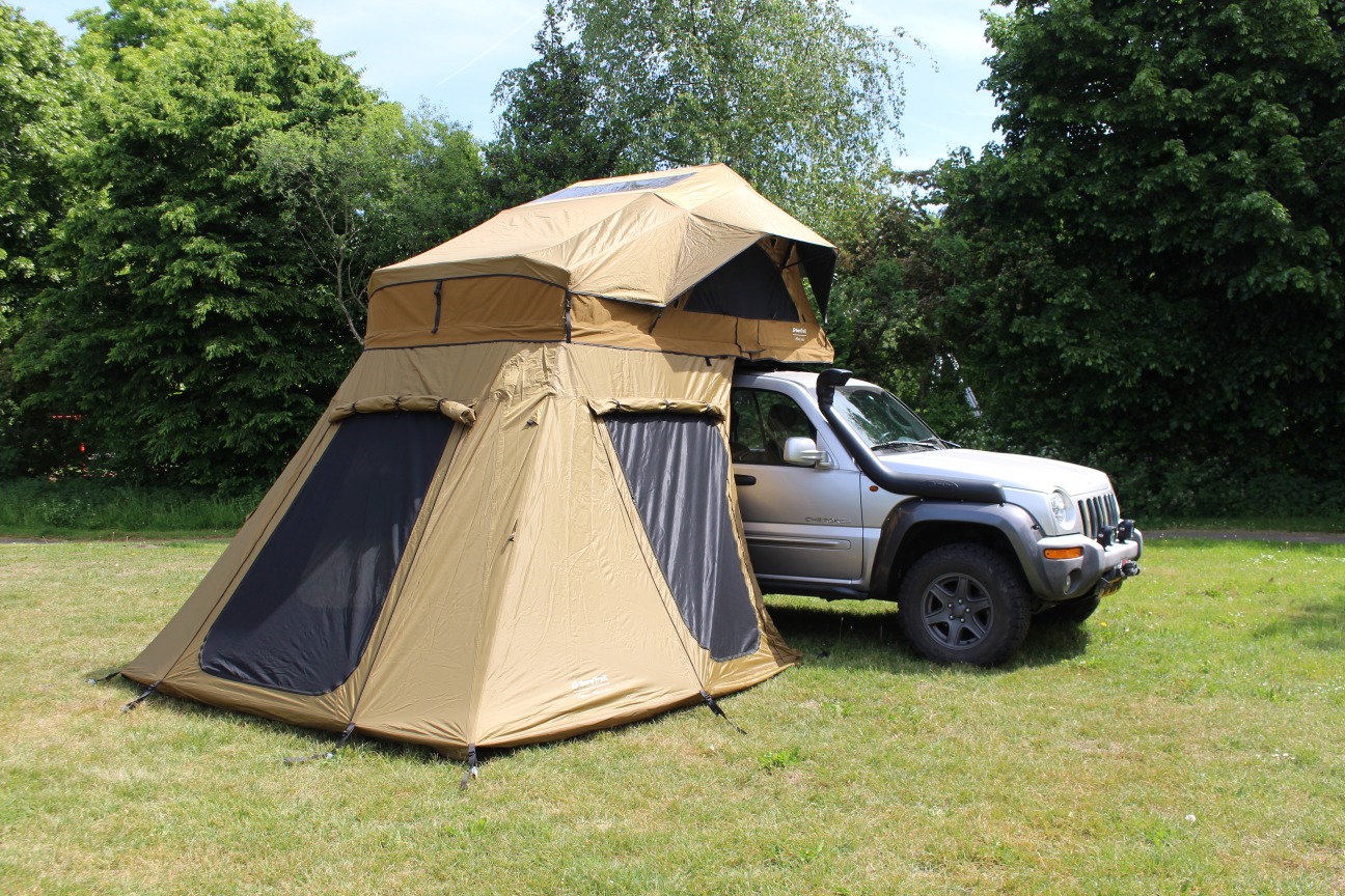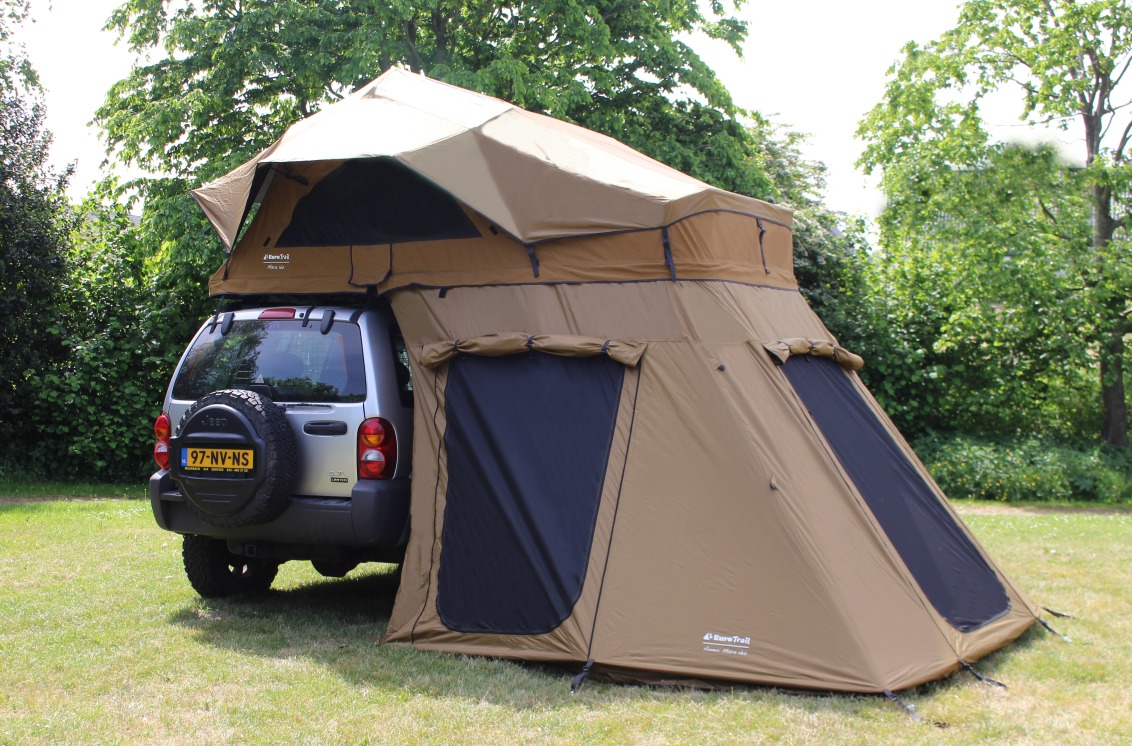 Esta tienda es ideal para estancias prolongadas en un mismo lugar. Ofrece mucho espacio adicional para dormir o guardar el equipo de acampada. La pared trasera de la tienda tiene una cremallera que permite acceder fácilmente al vehículo.